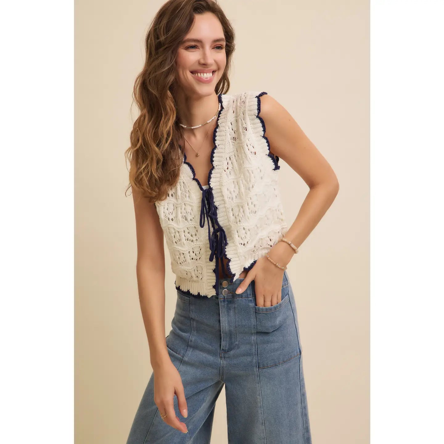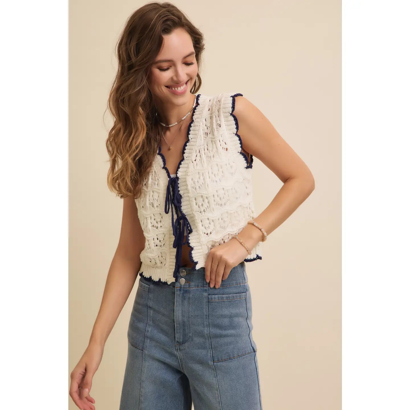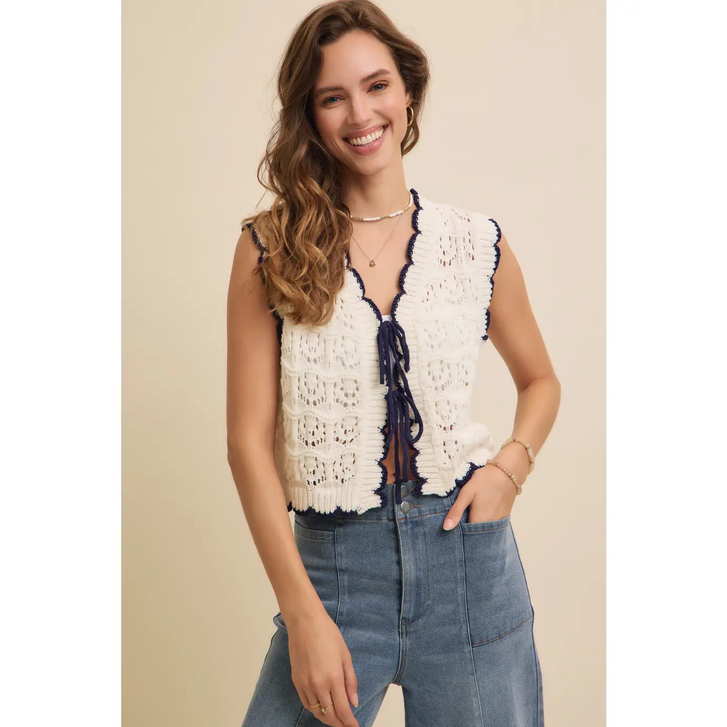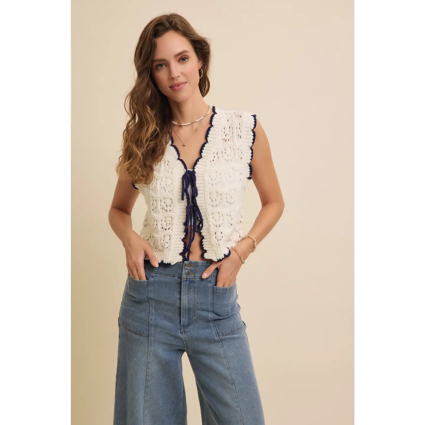 Features - Crochet knit sweater - Sleeveless - Sweater vets - Contrast scallop edge - Front bow tie details Contents - 60% COTTON 40% ACRYLIC Size + Fit Model is 5'10.5" and wearing a size Small Please refer to our size chart.