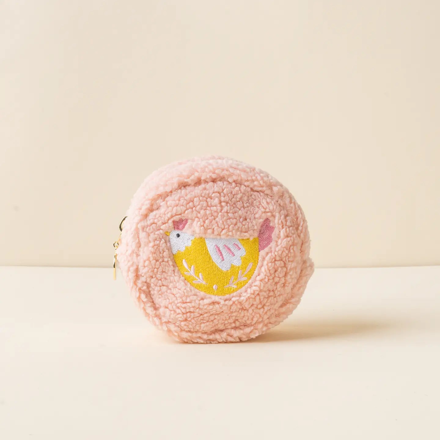 Keep your essentials stylish and organized with our circle teddy pouch. Crafted from soft sherpa fabric, this compact pouch features a wipeable lining for easy cleaning and gold zippers and hardware for a touch of sophistication. The interior is lined with a playful printed fabric. Perfect for holding smaller items like lipstick or chapstick, this pouch also pairs beautifully with our rectangle or square options.