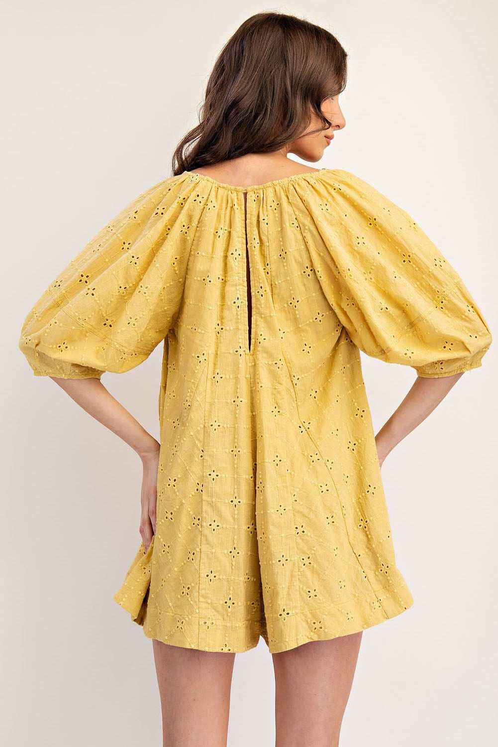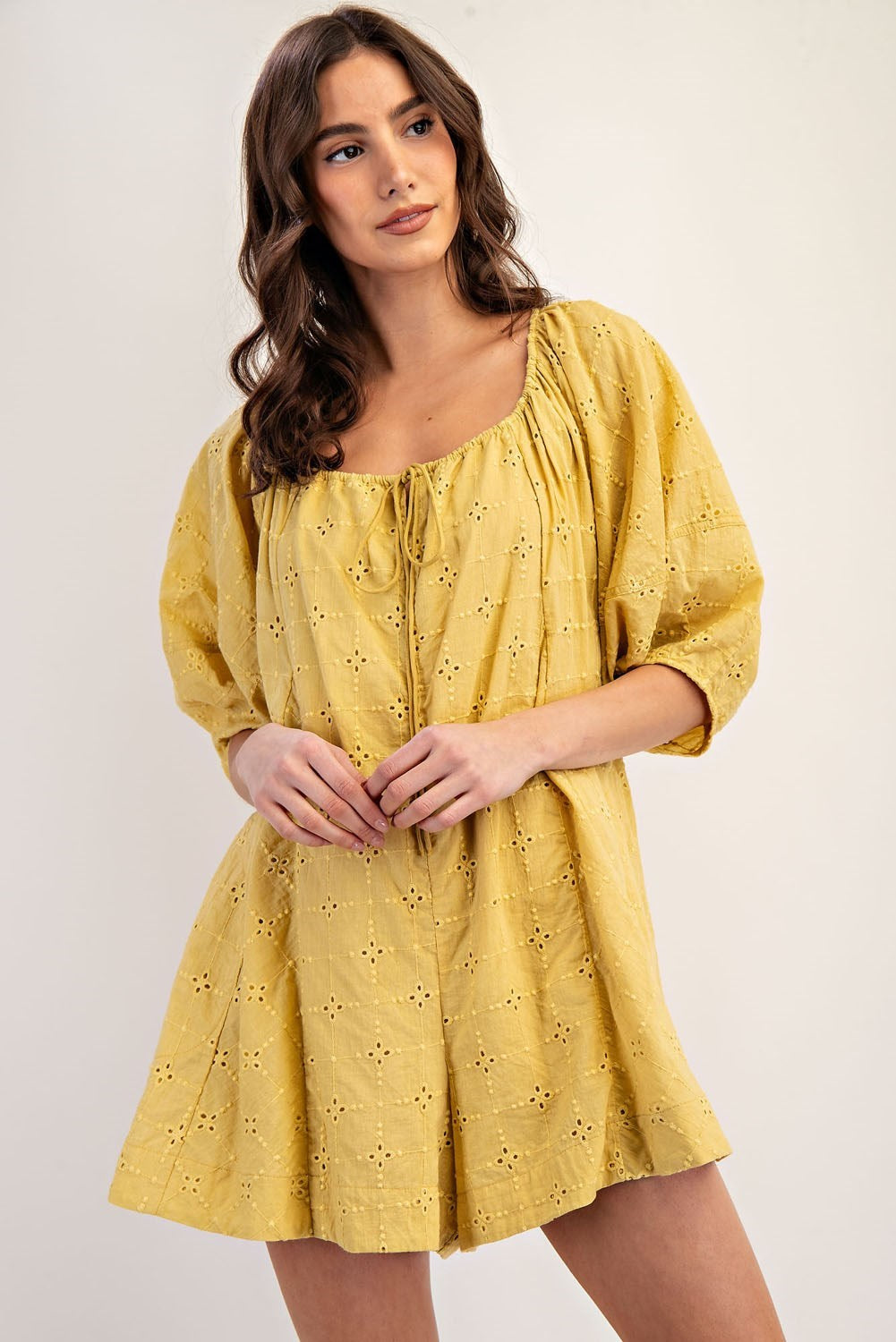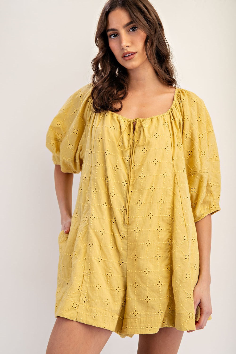 Product Detail: This eyelet romper features voluminous puff sleeves, a gathered scoop neckline with a front tie keyhole detail, a button and loop closure at the back creating a deep keyhole, two side hip pockets, and a lined design for a blend of delicate femininity and practical, effortless charm.