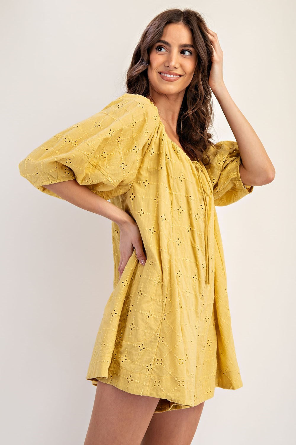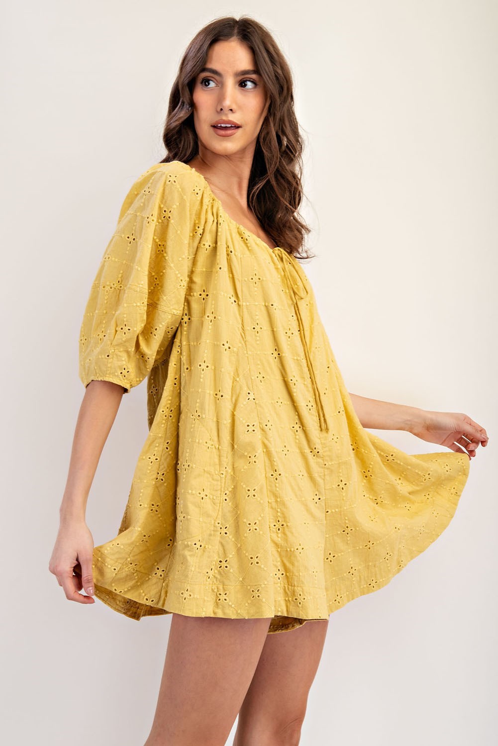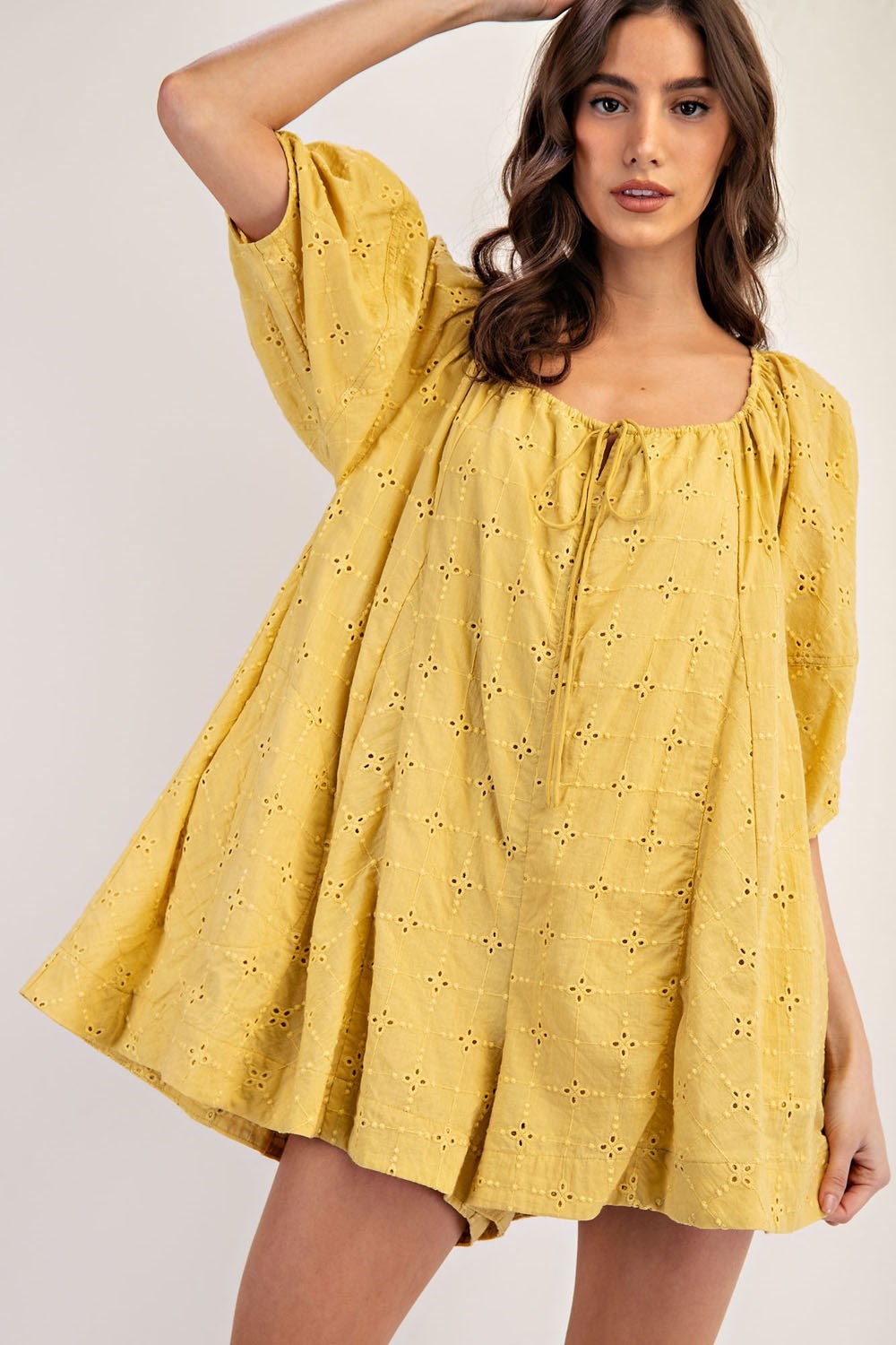Product Detail: This eyelet romper features voluminous puff sleeves, a gathered scoop neckline with a front tie keyhole detail, a button and loop closure at the back creating a deep keyhole, two side hip pockets, and a lined design for a blend of delicate femininity and practical, effortless charm.